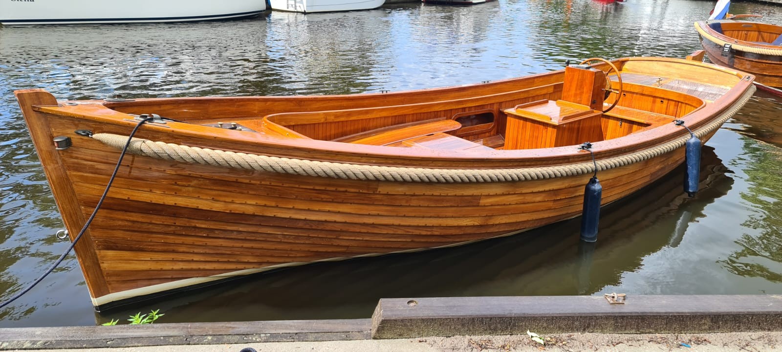 Deze prachtig gelijnde sloep van massief teakhout is een netjes onderhouden en heeft recent een grote motorbeurt gehad .